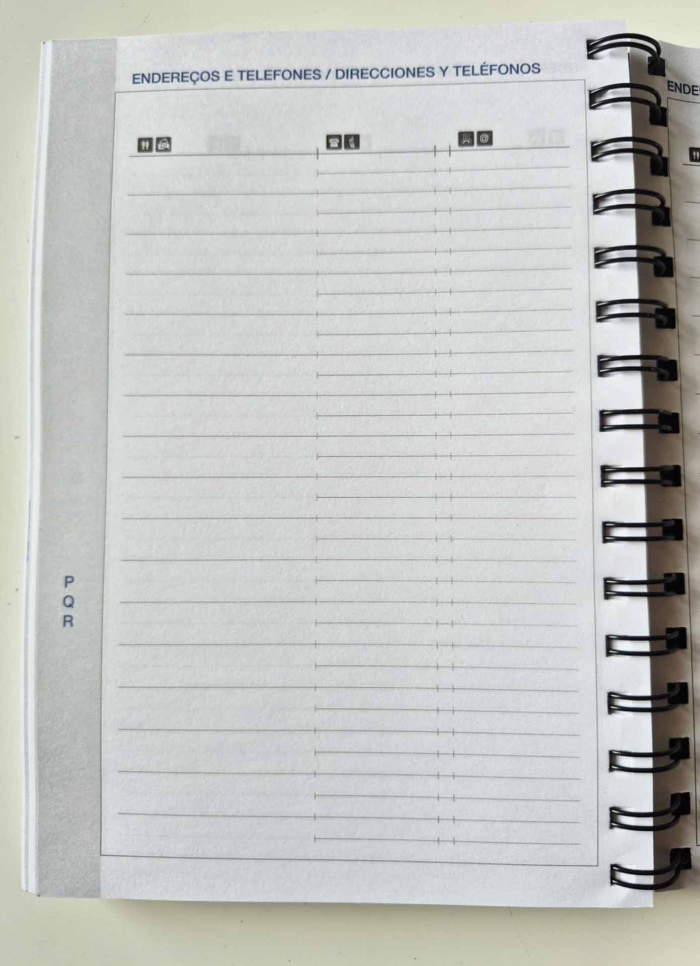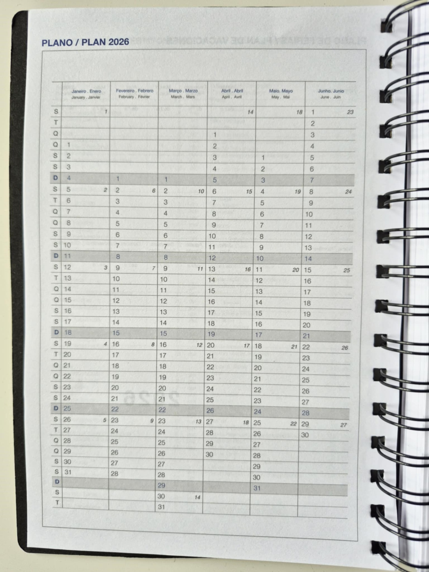 Características: Agenda diária A5. Capa em PU maleável, com argolas duplas e elástico preto com detalhe em cinzento. Contém 336 páginas, em papel branco 70 g/m², com certificação FSC (papel proveniente de florestas geridas de forma responsável). Idiomas principais: Português e Espanhol. No interior inclui: espaço para preenchimento de dados pessoais; calendário completo de 2026 e semestre de 2025 e 2027; feriados em lista; plano de férias; plano diário 2026 e espaço para preenchimento de contactos importantes (de A-Z).