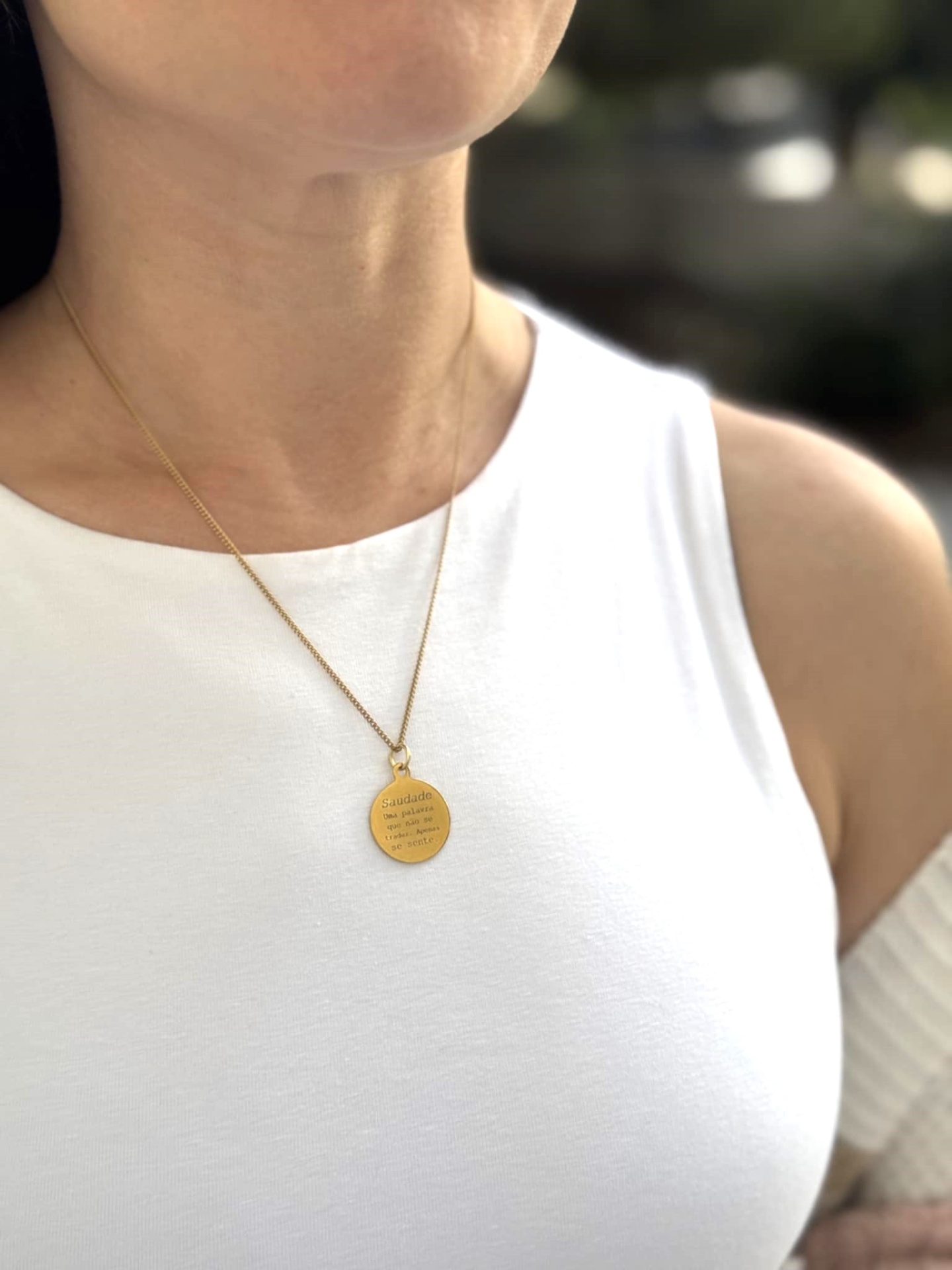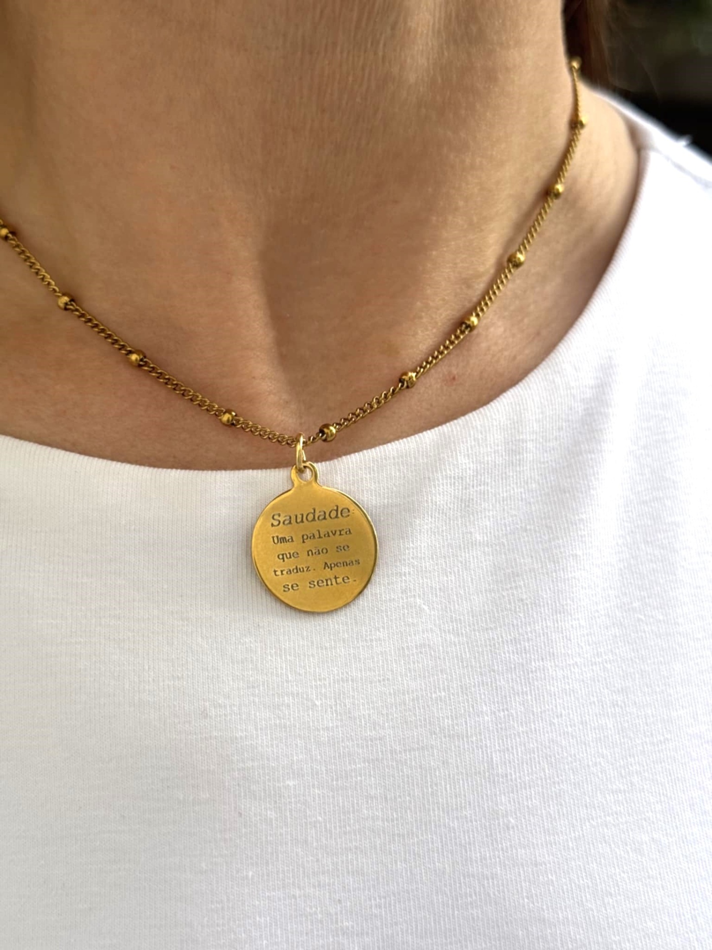 Colar Saudade 16,00 € Desconto de %. IVA incluído. Partilhar Cor Dourado Prateado Corrente Regular Choker ajustável Comprar Contactar Colar saudade - para usar no pescoço a frase que expressa um dos sentimentos mais especiais: a SAUDADE. Nossos colares vem com 3 opções de frases autorais e com duas opções de corrente: choker ajustável ou corrente regular! São de aço inoxidável na opção de dourado ou prateado! Não dão alergia e nem mudam de cor, podes molhar a vontade! Cada peça é gravada a laser por nós com muito amor em cada detalhe!