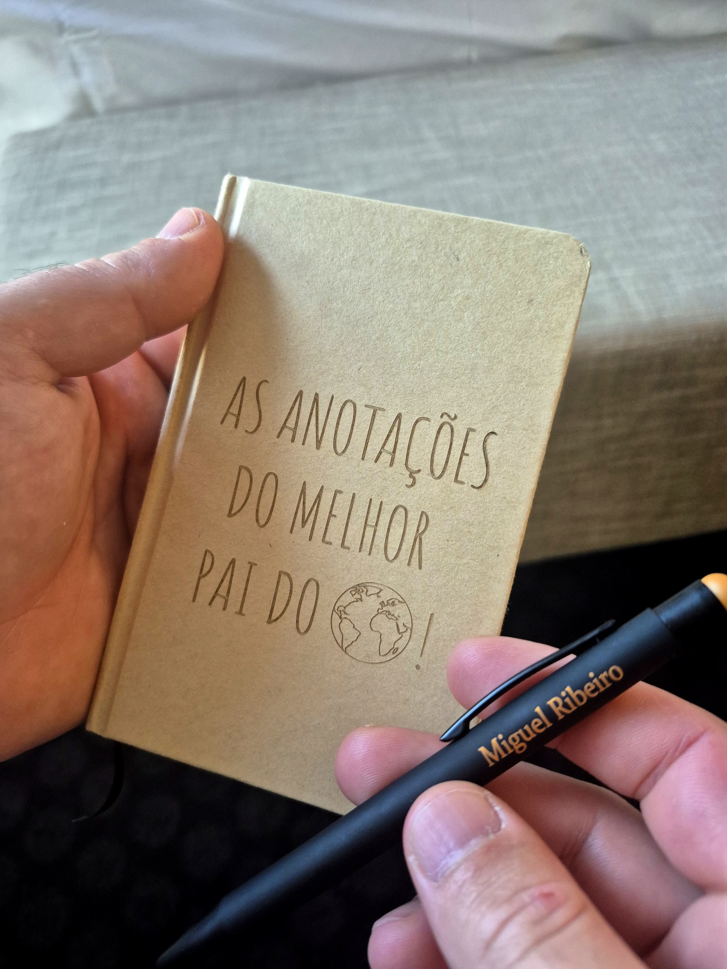 As anotações do melhor Pai do mundo vem junto com uma caneta que podes personalizar com o nome do teu pai! Só deixar nos comentários o nome para a Personalização!