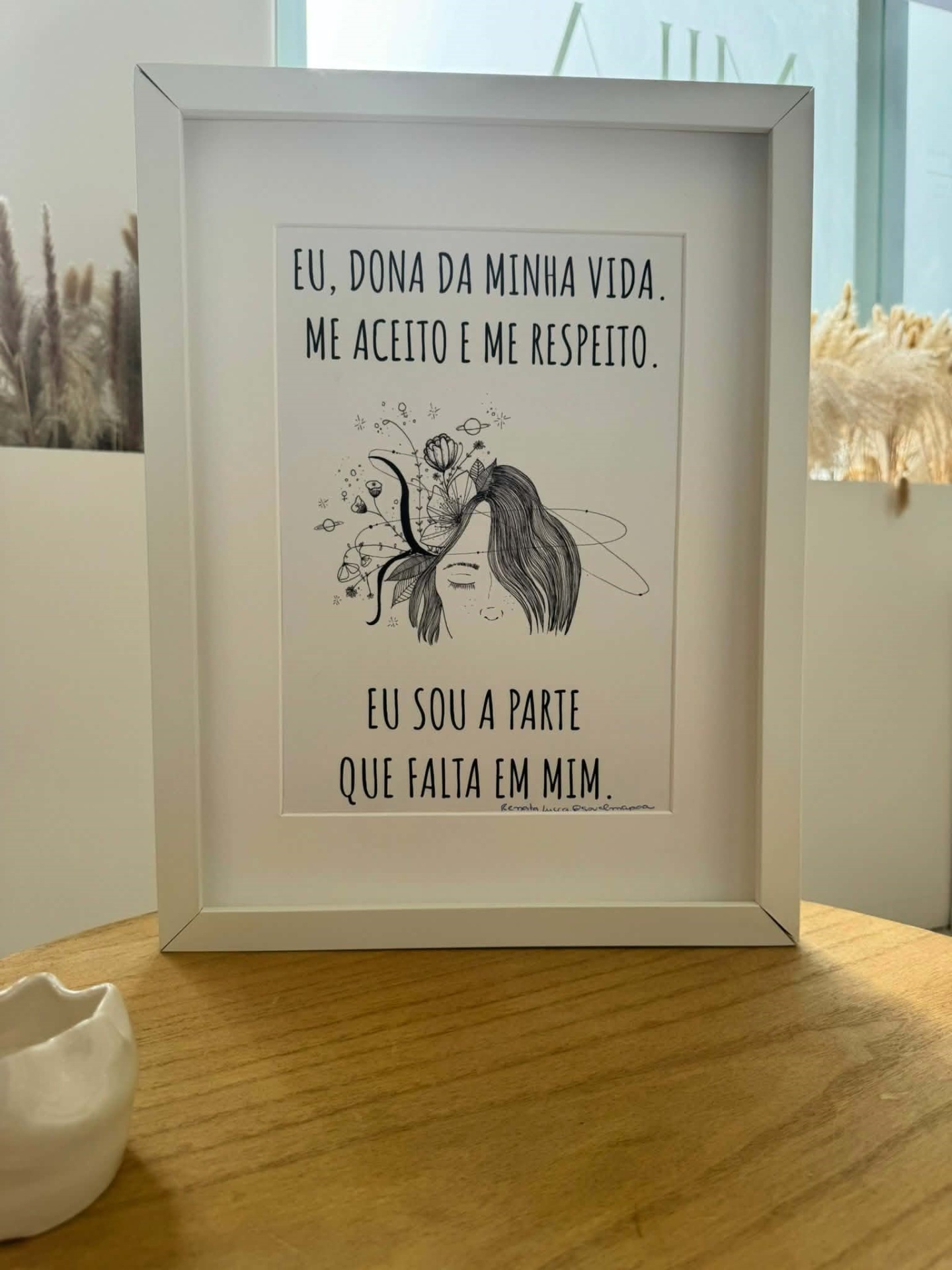 Print Dona da minha vida! 12,00 € Desconto de %. IVA incluído. Partilhar Comprar Contactar Eu, dona da minha vida. Me aceito e me respeito. Eu sou a parte que falta em mim. Poema autoral! PRINT tamanho A4 (venda sem moldura)